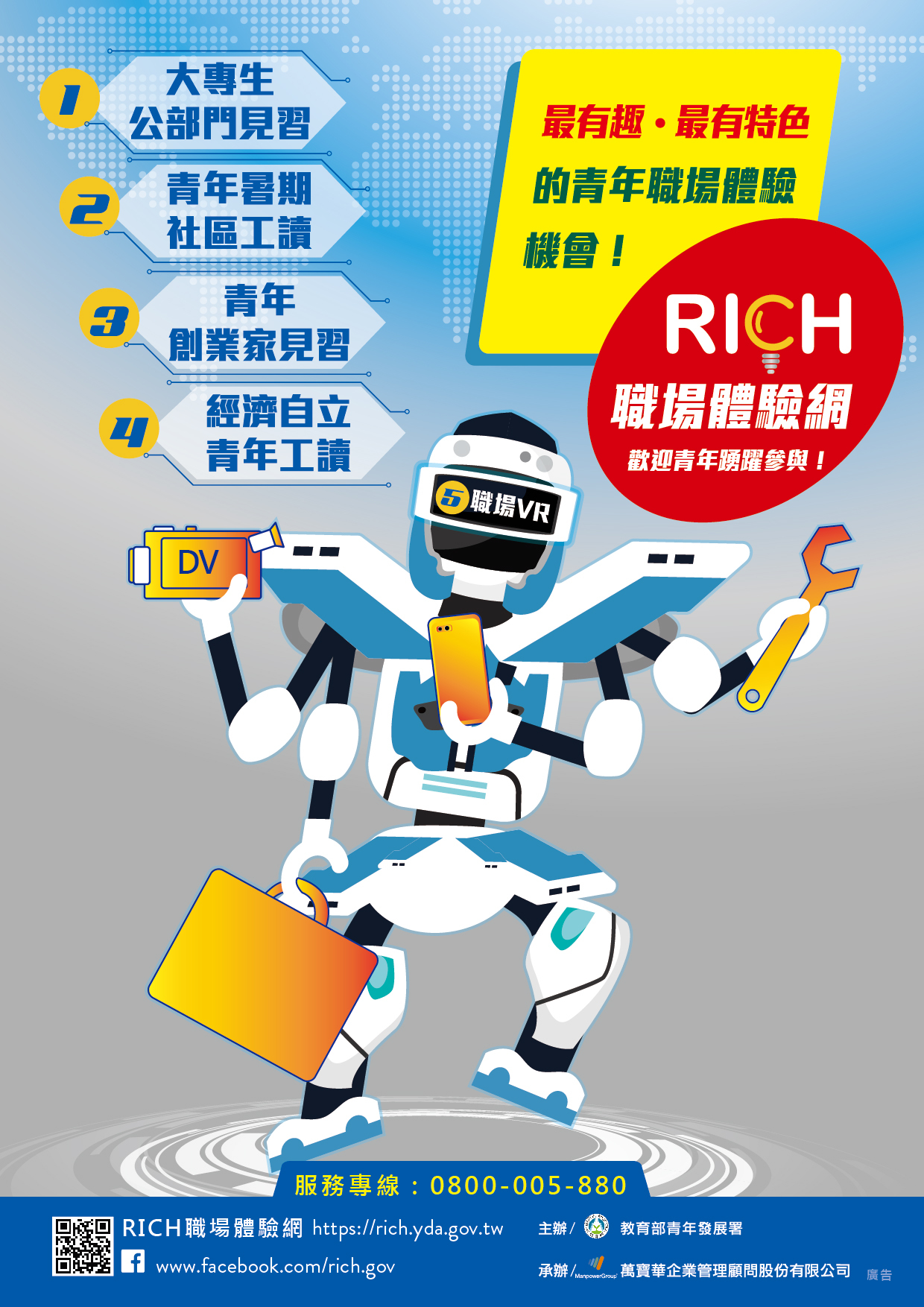 上開資源整合於「RICH職場體驗網」,讓青年累積職涯歷練經驗,為未來進入職場增加能量。